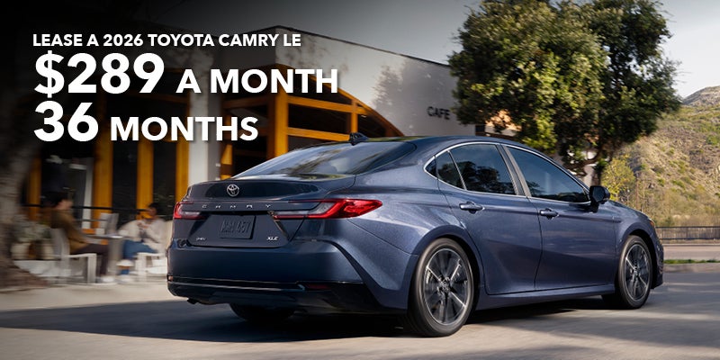 $3,999 due at signing. Security deposit waived. Terms available on approved credit through Toyota Financial Services (TFS) at participating Toyota dealers. Not all customers qualify. Lease example based on 2026 Camry 2WD 4Dr. Sedan LE Hybrid CVT Model 2559 with Total SRP of $30,759, net capitalized cost of $26,537, and a lease end purchase amount of $20,916. $3,999 Due At Signing includes $3,710 customer down payment and first month's payment of $289. Lessee responsible for maintenance, excess wear and use, and will pay $0.15 per mile for all mileage over 10,000 miles per year. $350 disposition fee is due at lease end. Offer cannot be combined with TFS Finance Cash, Down Payment Assistance, Trade-in Assistance, Customer Cash, APR, Finance Subvention Cash. Dealer Doc Fee of $129 not included. Expires 05-04-2026.