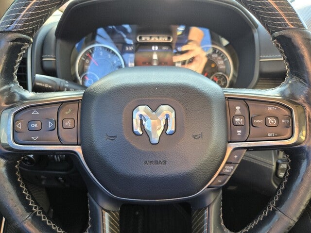 1500 Limited, 4D Crew Cab, HEMI 5.7L V8 Multi Displacement VVT, 8-Speed Automatic, 4WD, Patriot Blue Pearlcoat, Indigo/Frost w/Premium Leather Trimmed Bucket Seats, 1-Yr SiriusXM Guardian Trial, 10 Speakers, 12 Touchscreen Display, 3.21 Rear Axle Ratio, 33 Gallon Fuel Tank, 4 Adjustable Cargo Tie-Down Hooks, 4-Wheel Disc Brakes, 48V Belt Starter Generator, ABS brakes, Adaptive Cruise Control w/Stop & Go, Adjustable pedals, Advanced Brake Assist, Air Conditioning, Alloy wheels, AM/FM radio: SiriusXM with 360L, Apple CarPlay, Apple CarPlay/Android Auto, Audio memory, Auto High-beam Headlights, Auto-dimming door mirrors, Auto-dimming Rear-View mirror, Auto-leveling suspension, Automatic temperature control, Bed Utility Group, Bodyside moldings, Brake assist, Bumpers: chrome, Compass, Delay-off headlights, Disassociated Touchscreen Display, Dome Dual LED Reading Lamp, Driver door bin, Driver vanity mirror, Dual front impact airbags, Dual front side impact airbags, Dual-Pane Panoramic Sunroof, Electronic Stability Control, Emergency communication system: SiriusXM Guardian, Front anti-roll bar, Front Bucket Seats, Front Center Armrest w/Storage, Front dual zone A/C, Front fog lights, Front reading lights, Front wheel independent suspension, Full Speed Forward Collision Warning Plus, Fully automatic headlights, Garage door transmitter, Genuine wood console insert, Genuine wood dashboard insert, Genuine wood door panel insert, Google Android Auto, GPS Antenna Input, GPS Navigation, harman/kardon 19 Speaker Premium Sound, HD Radio, Heated door mirrors, Heated front seats, Heated rear seats, Heated steering wheel, Illuminated entry, Integrated Center Stack Radio, Lane Keep Assist, Leather steering wheel, LED Dome/Reading Lamp, Limited Level 1 Equipment Group, Low tire pressure warning, Memory seat, Navigation System, No Satellite Coverage w/HI/AK/PR/VI/GU, Occupant sensing airbag, Outside temperature display, Overhead airbag, Overhead console, Panic alarm, Parallel & Perp Park Assist w/Stop, ParkView Rear Back-Up Camera, Passenger door bin, Passenger vanity mirror, Pedal memory, Pick-Up Box Lighting, Power door mirrors, Power driver seat, Power passenger seat, Power steering, Power windows, Premium Leather Trimmed Bucket Seats, Quick Order Package 27M Limited, Radio data system, Radio: Uconnect 12 w/Navigation, Rain sensing wipers, RamBox Cargo Management System, Rear anti-roll bar, Rear seat center armrest, Rear step bumper, Rear window defroster, Remote CD player, Remote keyless entry, Security system, SiriusXM Satellite Radio, SiriusXM Traffic Plus, SiriusXM Travel Link, SiriusXM w/360L, Speed control, Split folding rear seat, Steering wheel mounted audio controls, Tachometer, Telescoping steering wheel, Tilt steering wheel, Traction control, Tri-Fold Tonneau Cover, Trip computer, Turn signal indicator mirrors, USB Host Flip, Variably intermittent wiper